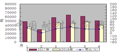 2017年1-6月,我國棕剛玉出口總量約為31.19萬噸,較去年同期增長29.2%,出口總金額約18546.98萬美元,同比增長16.1%。其中6月份棕剛玉出口總量約為5.08萬噸,同比增長28.1%;出口金額約為3019.76萬美元,同比增長16.1%。
